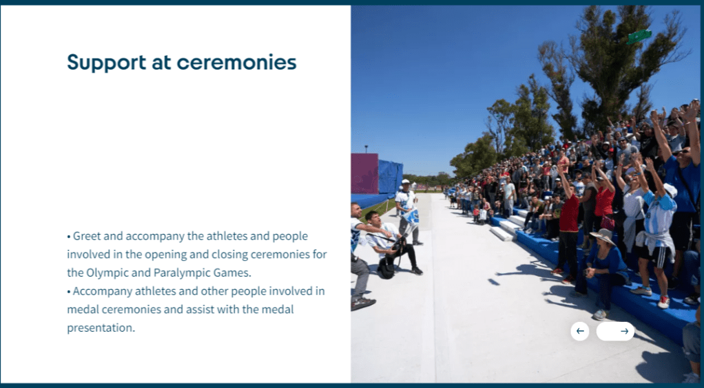 Sự kiện sẽ diễn ra tại Pháp và hướng đến các công dân đang sinh sống tại Việt Nam trên 18 tuổi tại thời điểm diễn ra Thế vận hội. Các tình nguyện viên được chọn sẽ tham gia tổ chức lễ khai mạc và bế mạc cuộc thi và / hoặc các sự kiện Olympic khác. Công việc tình nguyện bao gồm nhiều nhiệm vụ như sau: quan hệ quốc tế, chuẩn bị dụng cụ cho cuộc thi, truyền thông (tất cả các phương tiện truyền thông và mạng xã hội), biên và phiên dịch, dịch vụ y tế, lái xe, marketing, nhân sự, chương trình văn hóa, hậu cần, an ninh và vận tải, v.v.