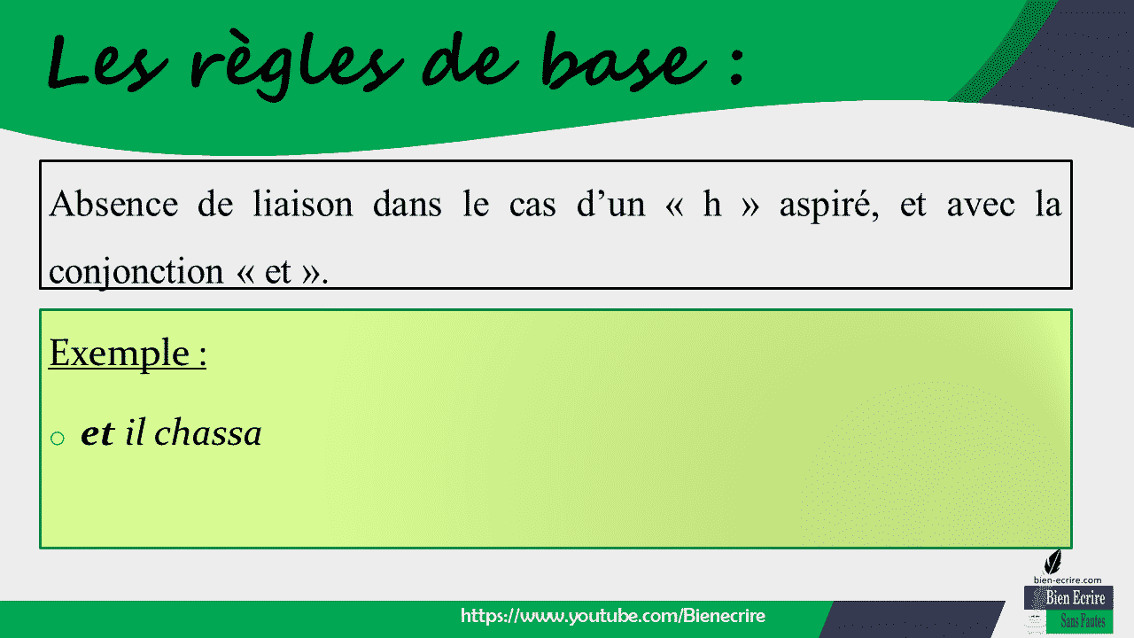 – Absence de liaison dans le cas d’un « h » aspiré, et avec la conjonction « et ».