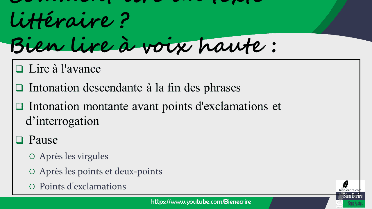 Pour une lecture expressive de qualité, pensez à bien définir le volume sonore et le débit. Il est aussi important de veiller à la qualité de la diction et à la netteté des mots et phrases prononcés. L’observation d’une pause est indispensable à chaque ponctuation et à chaque fin de paragraphe. Bienécrire vous explique en détail les techniques de la lecture expressive dans cette leçon de français.