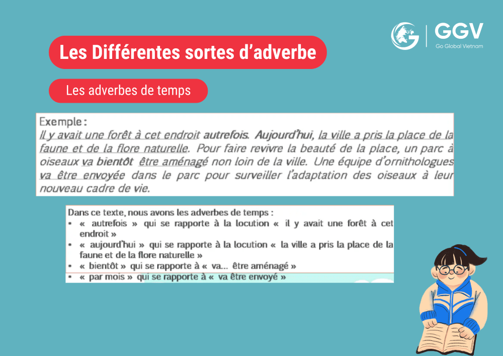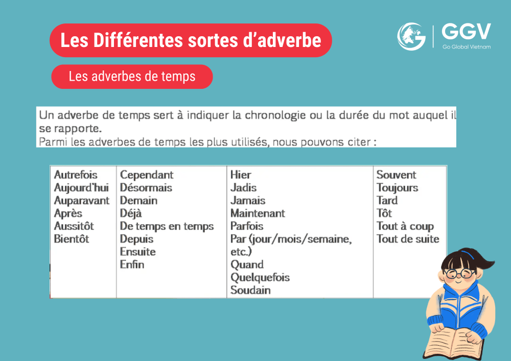 - Temps : Ils expriment une notion de temps ou de durée. Exemples : maintenant, bientôt, hier, aujourd’hui, demain, tôt, tard, toujours, jamais, autrefois, etc.