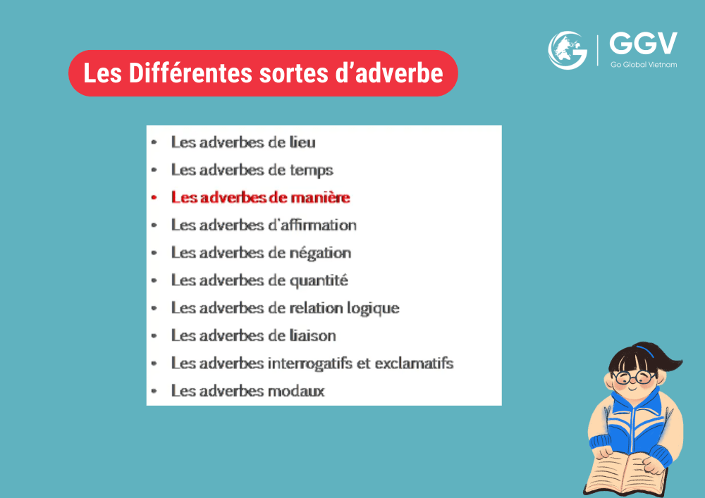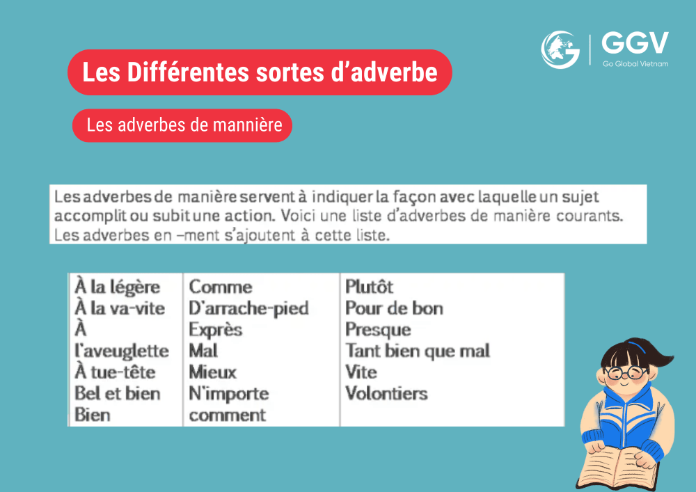 - Manière : Ils indiquent comment une action est réalisée. Beaucoup d’entre eux se terminent en « -ment ». Exemples : lentement, bien, mal, gentiment, ainsi, volontiers, etc.