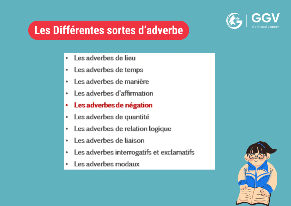 - Lieu : Ils indiquent l’endroit ou la direction. Exemples : ici, là, ailleurs, partout, dedans, dehors, derrière, etc.