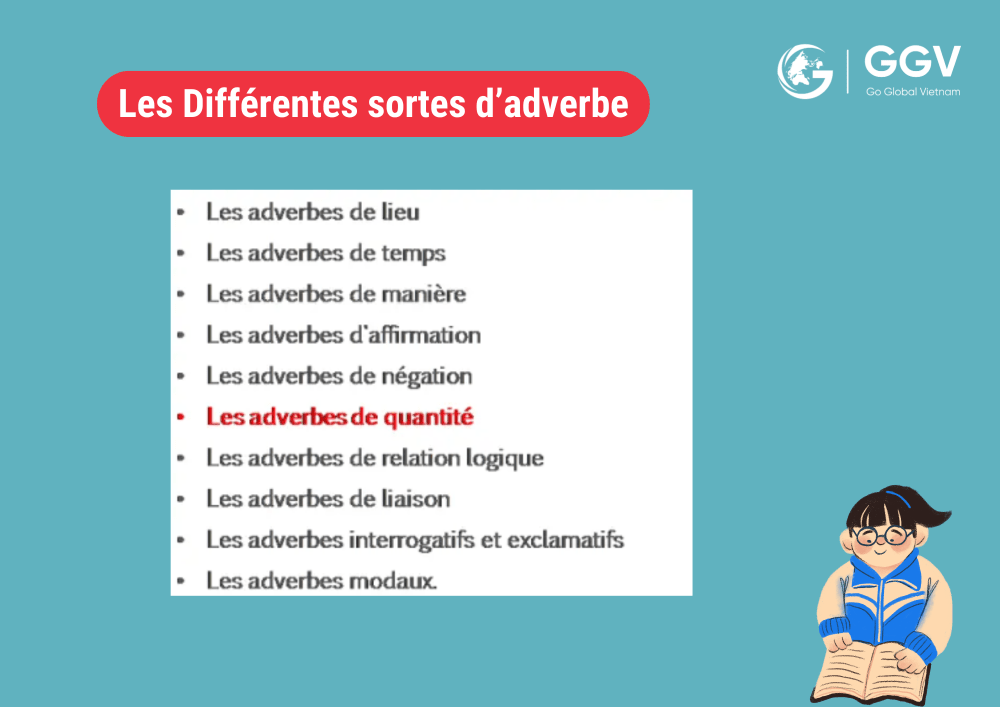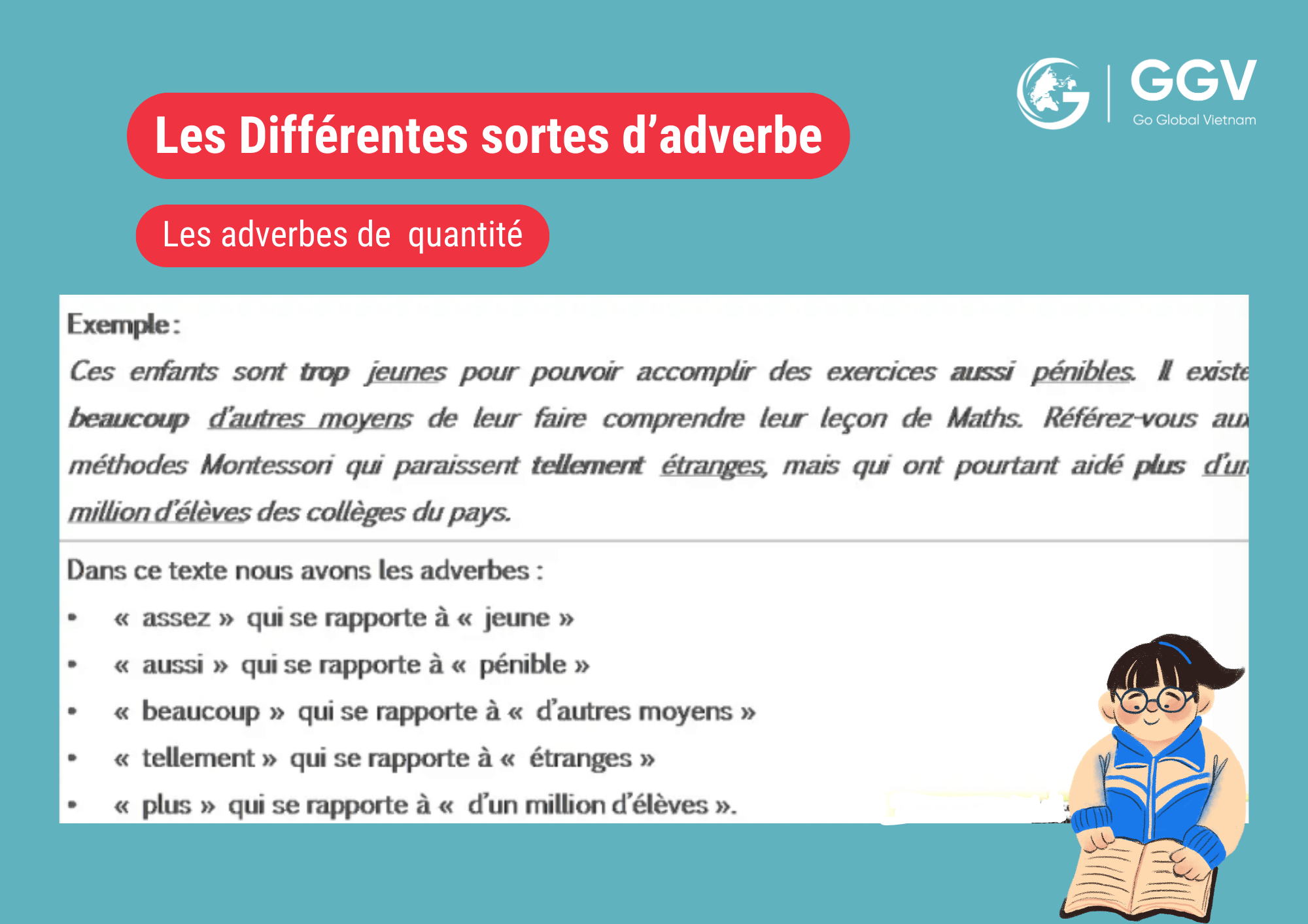- Quantité : Ils expriment une mesure, un degré ou une intensité. Exemples : beaucoup, peu, assez, trop, plus, moins, très, tant, autant, etc.