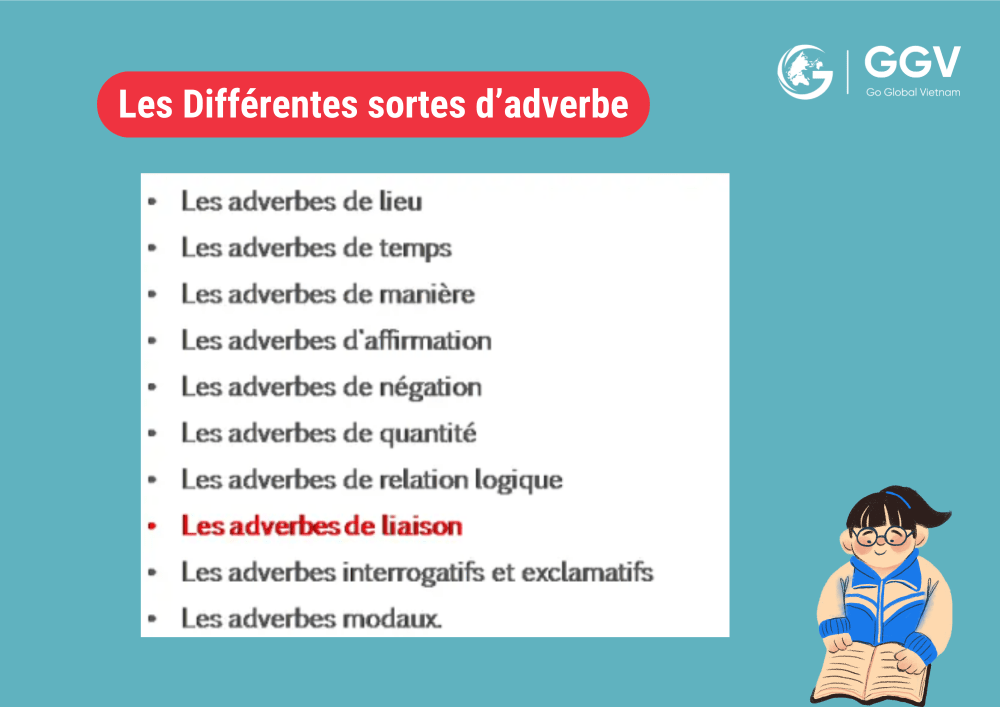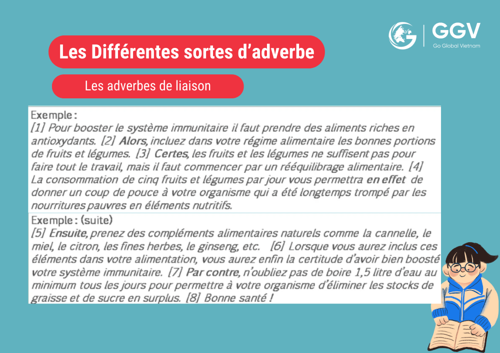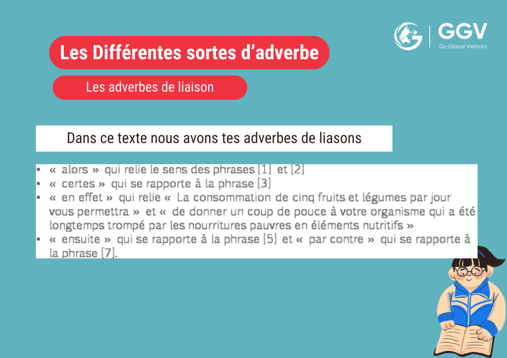 - Liaison : Ils servent à relier des phrases ou des propositions entre elles. Exemples : alors, ainsi, aussi, d’ailleurs, par ailleurs, enfin, etc.