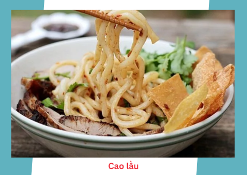 Les nouilles de riz utilisées dans le Cao Lau sont plus épaissesque les nouilles « bun » ou « pho » que l’on retrouve dans le Nord Vietnam. Les nouilles sont servies avec des tranches de porc laqué et différentes herbes et feuilles de salade. Le tout est mélangé dans un fond de bouillon de porc.
