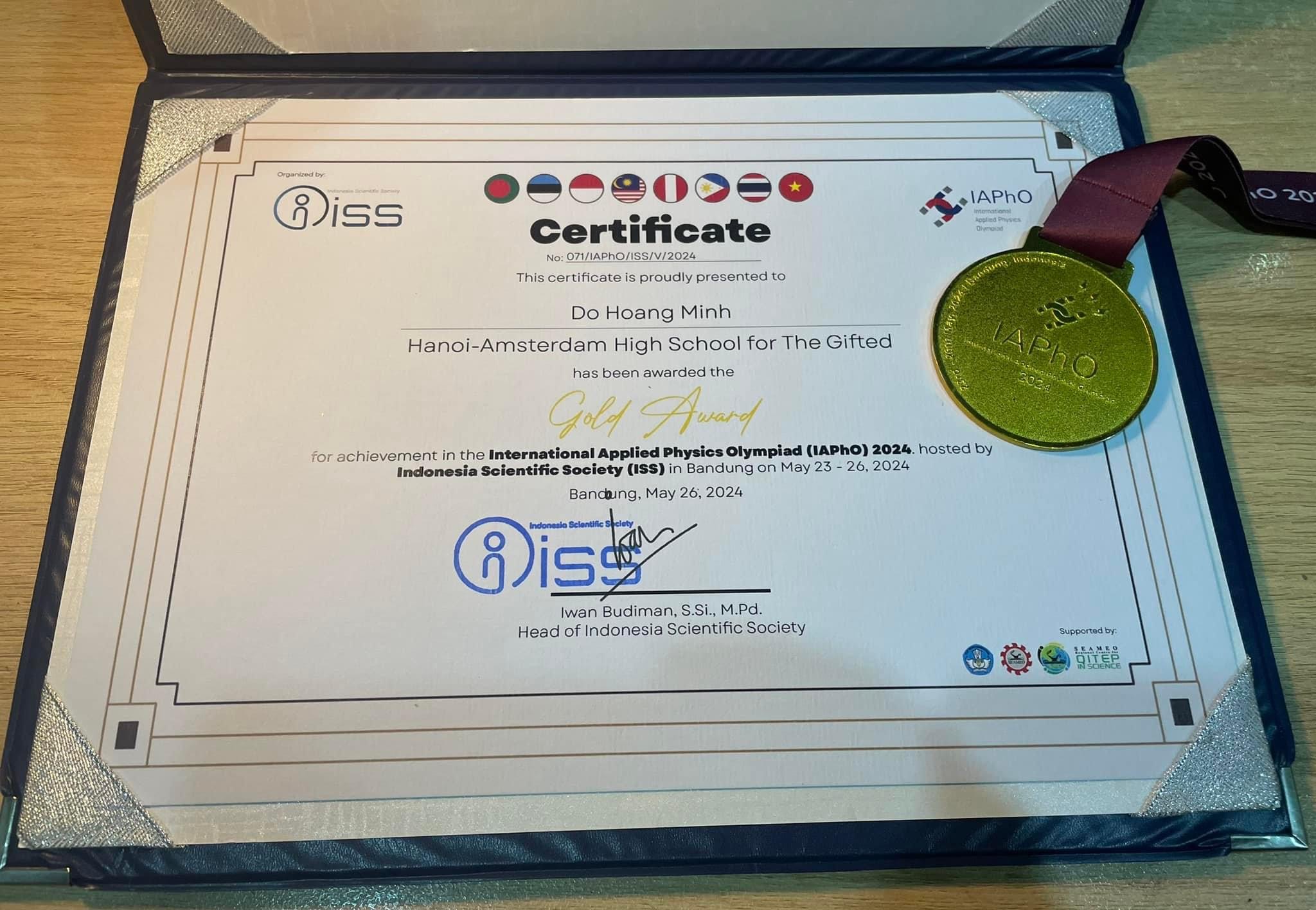 GGV phấn khởi tự hào khi nhận được thông tin cựu học viên GGV – Đỗ Hoàng Minh (hiện đang học tại (THPT chuyên Hà Nội – Amsterdam) đã xuất sắc đạt giải Vàng cho cuộc thi Vật lý ứng dụng Quốc tế (International Applied Physics Olympiad – IAPhO 2024). Cuộc thi được tổ chức bởi Hiệp hội Khoa học Indonesia (Indonesian Scientific Society – ISS) kéo dài từ ngày 23 đến 26/5 tại thành phố Bandung, Indonesia. Em đã vượt qua nhiều thí sinh tham dự tới từ các nước như Indonesia, Thái Lan, Bangladesh, Philippines, Malaysia, Estonia, Peru và Việt Nam để trở thành 1 trong 5 bạn xuất sắc đạt giải Vàng danh giá tại cuộc thi.