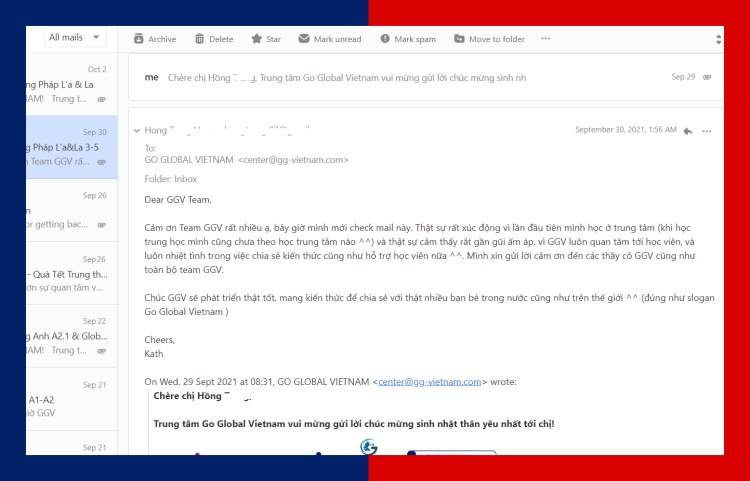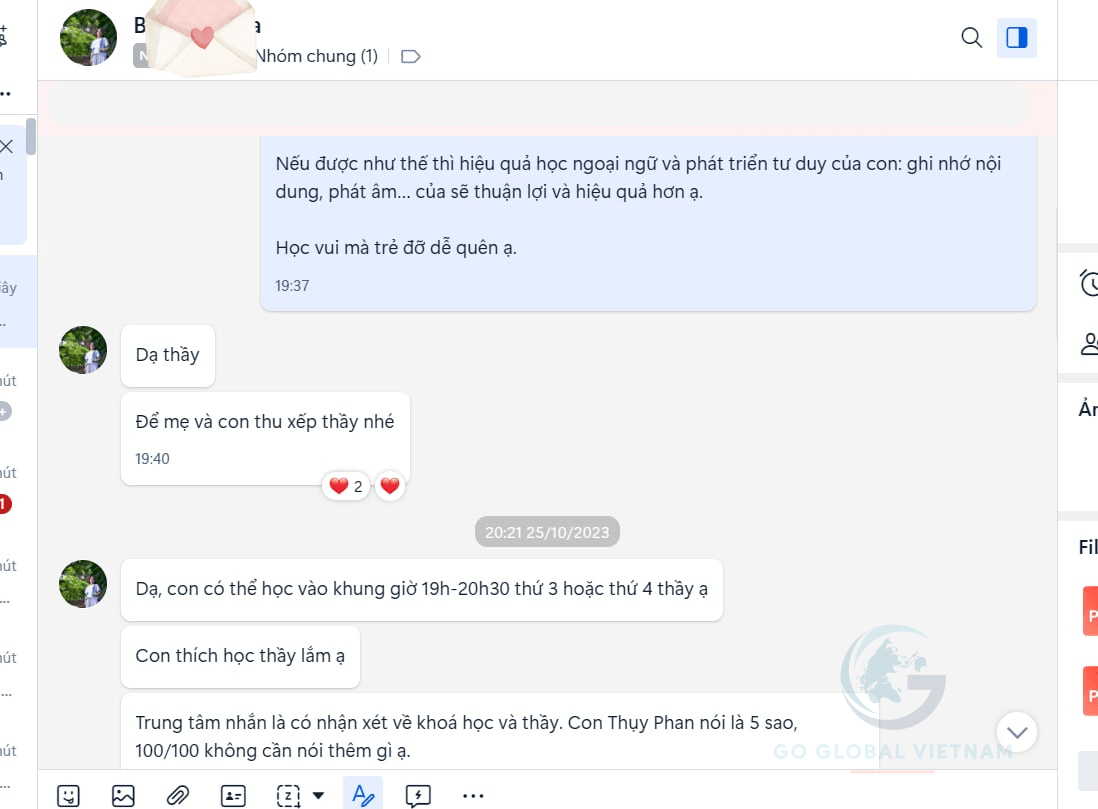 - “Thank you Go Global Vietnam very much for your French classes: 5 stars sessions. I am fully satisfied with my online course!”