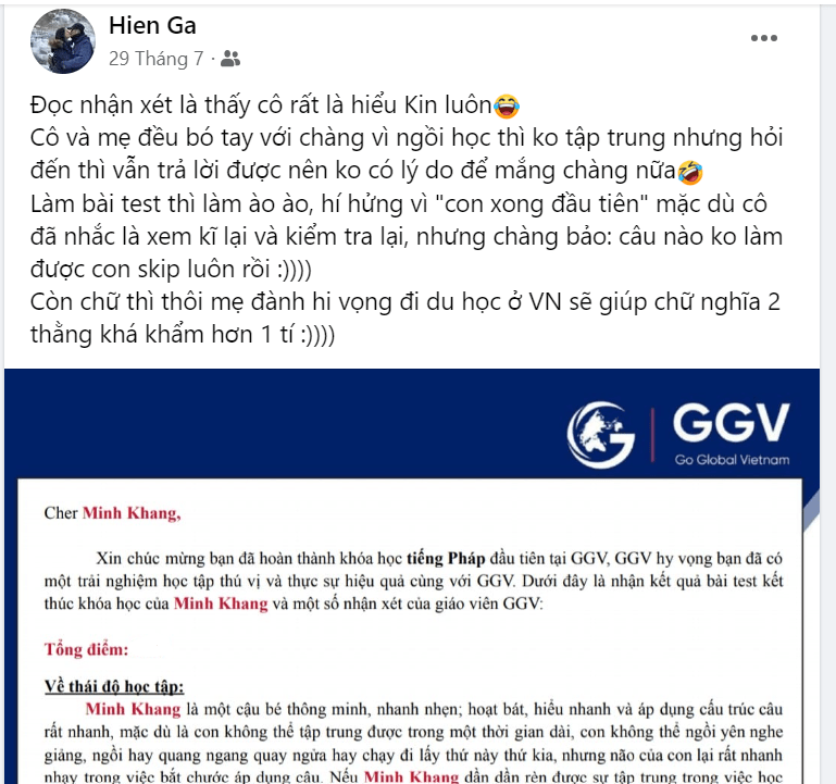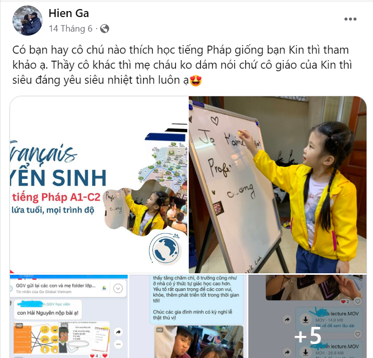 Được biết trong khoảng thời gian học online cùng với GGV, bé Linh 6 tuổi sang Pháp cùng gia đình trong 1 tháng. Nhờ có giáo trình phù hợp và giáo viên giỏi, tâm huyết mà chỉ sau gần một khóa học con đã có thể tự tin giao tiếp và order món với người Pháp. Sự tiến bộ này của con khiến cả GGV và gia đình vui mừng khôn xiết